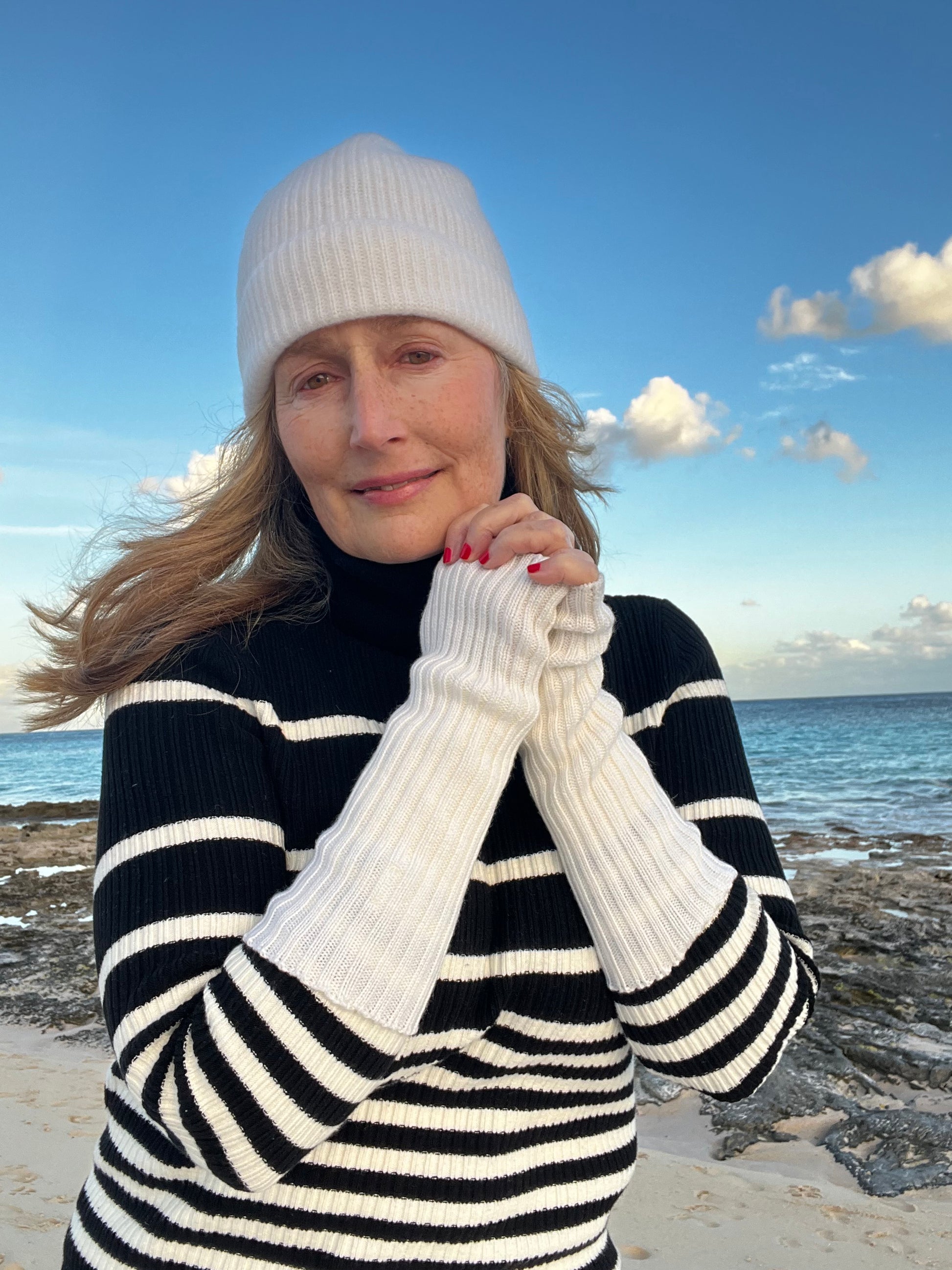 Elevate your style with our exquisite white cashmere beanie, thoughtfully inspired by the sweet fragrance of island freesias. This timeless accessory blends unmatched comfort with the delicate charm of these blooming beauties, making it a must-have addition to your wardrobe for both warmth and elegance. Knitted with 100% pure Scottish cashmere it has an ultra-fine feel fit for a cozy-chic style. One size fits most. Dry Clean.